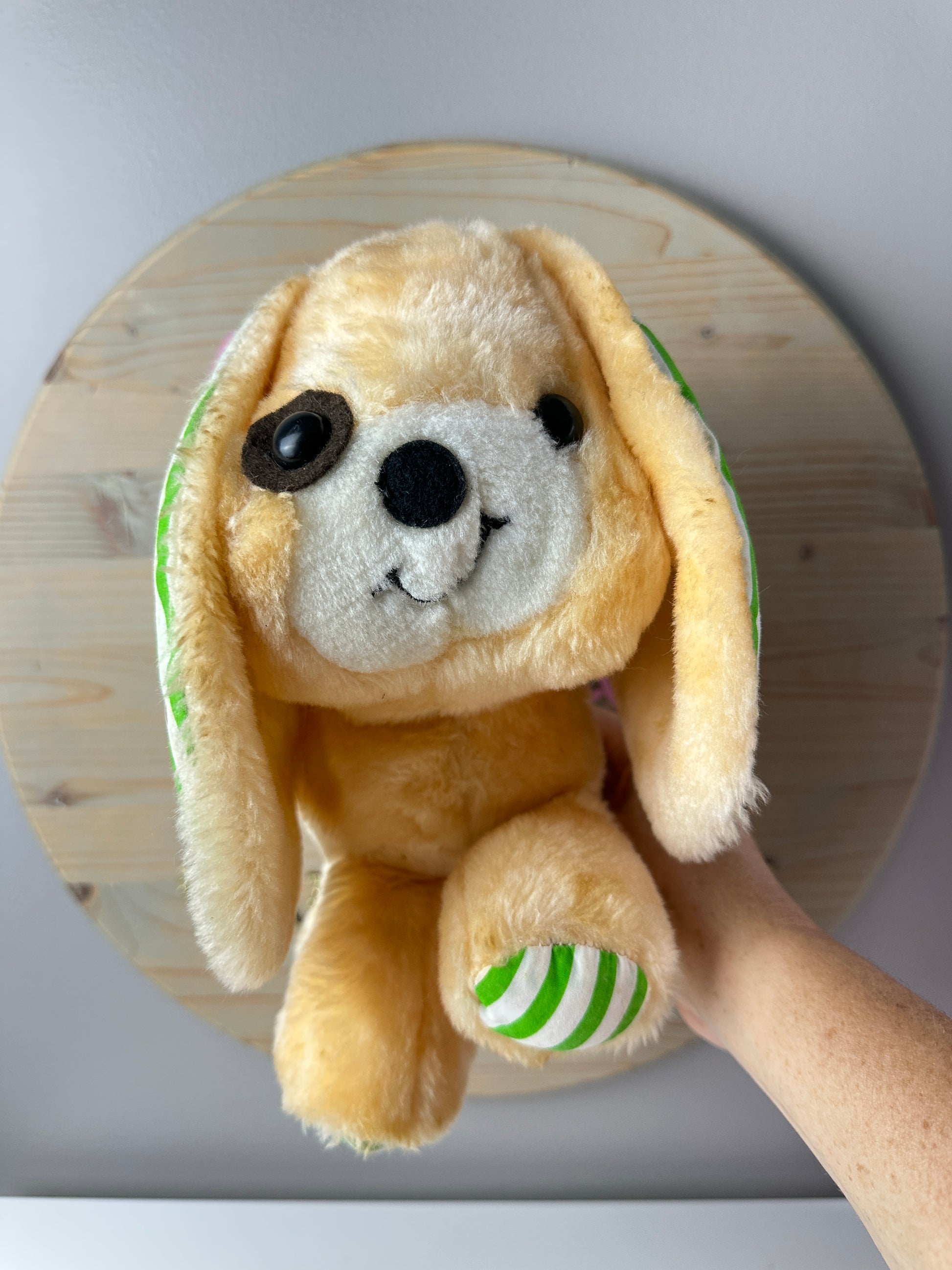 This is the large plush version of Pupcake. He's missing his collar. He's minty except for some light surface dirt and unraveling tag. A spot clean would make him gorgeous!