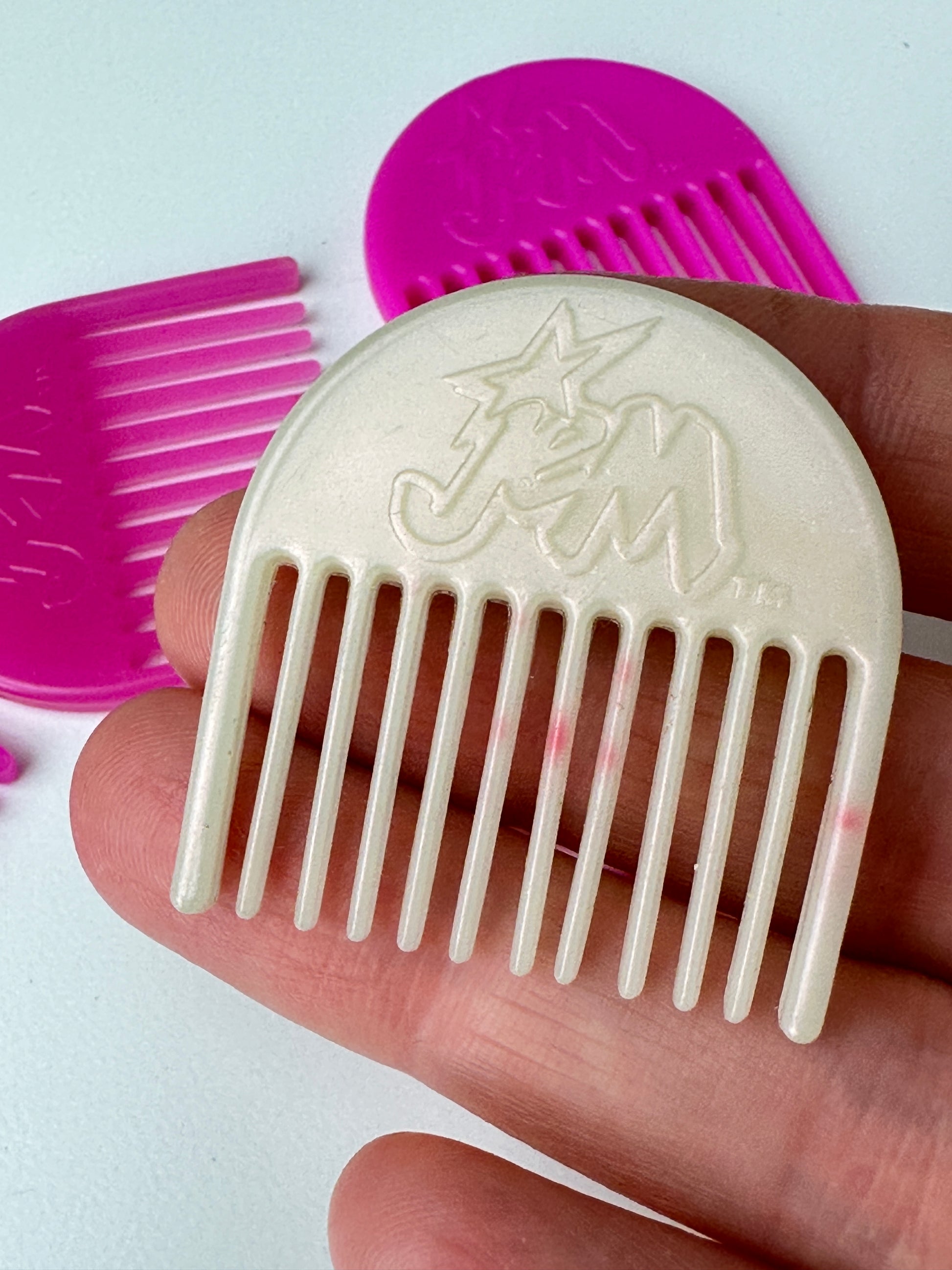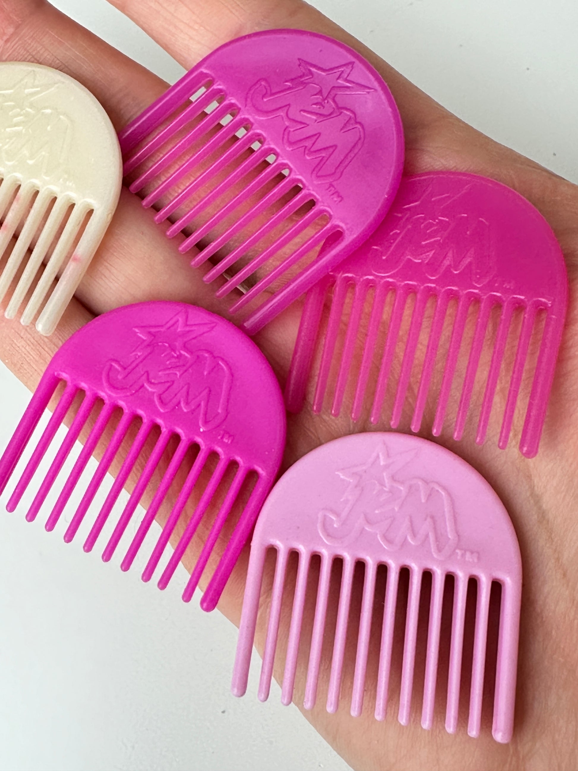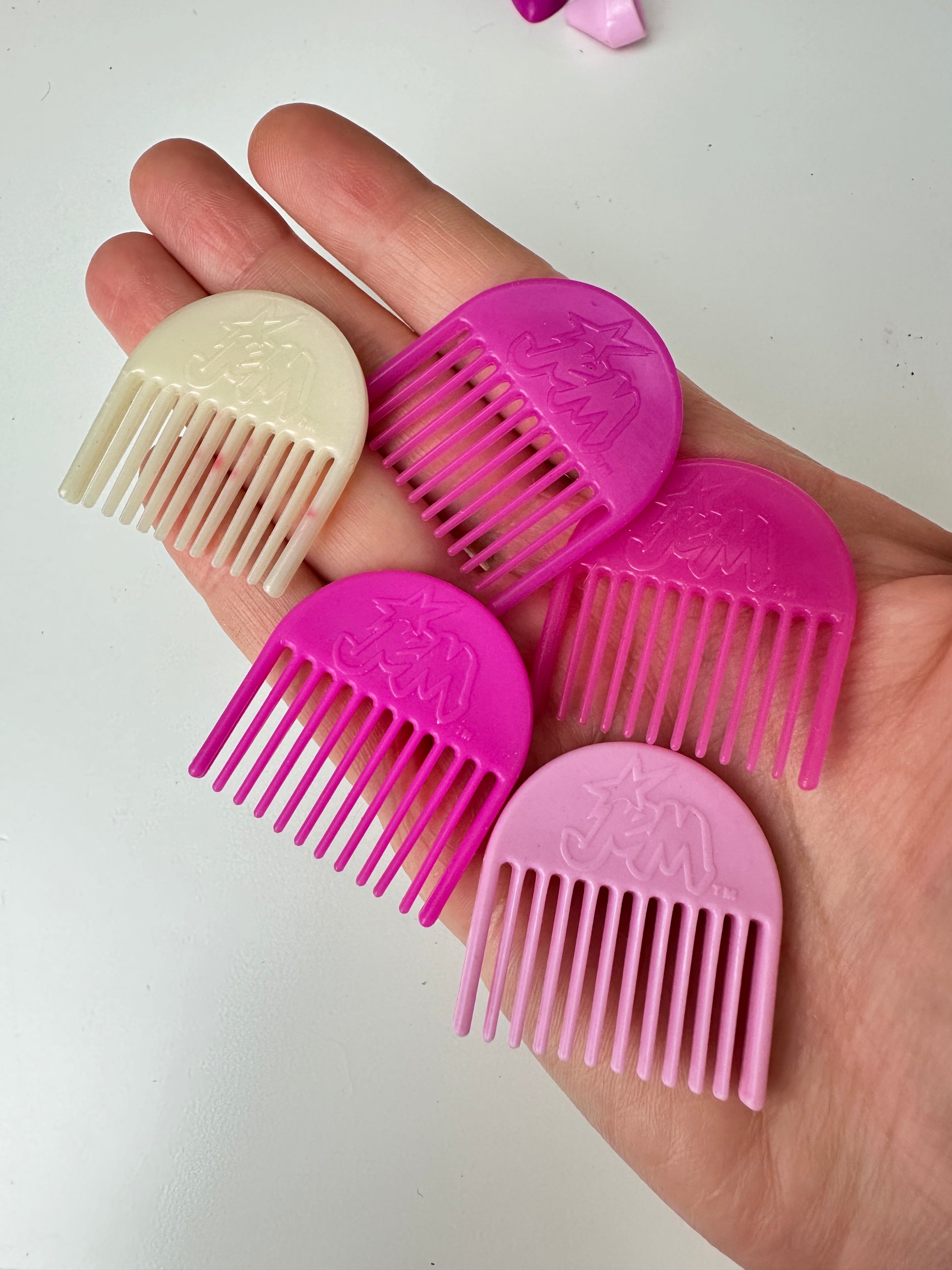 These five Hasbro Jem combs are in excellent, played with condition. The white one has several pink spots on one side.