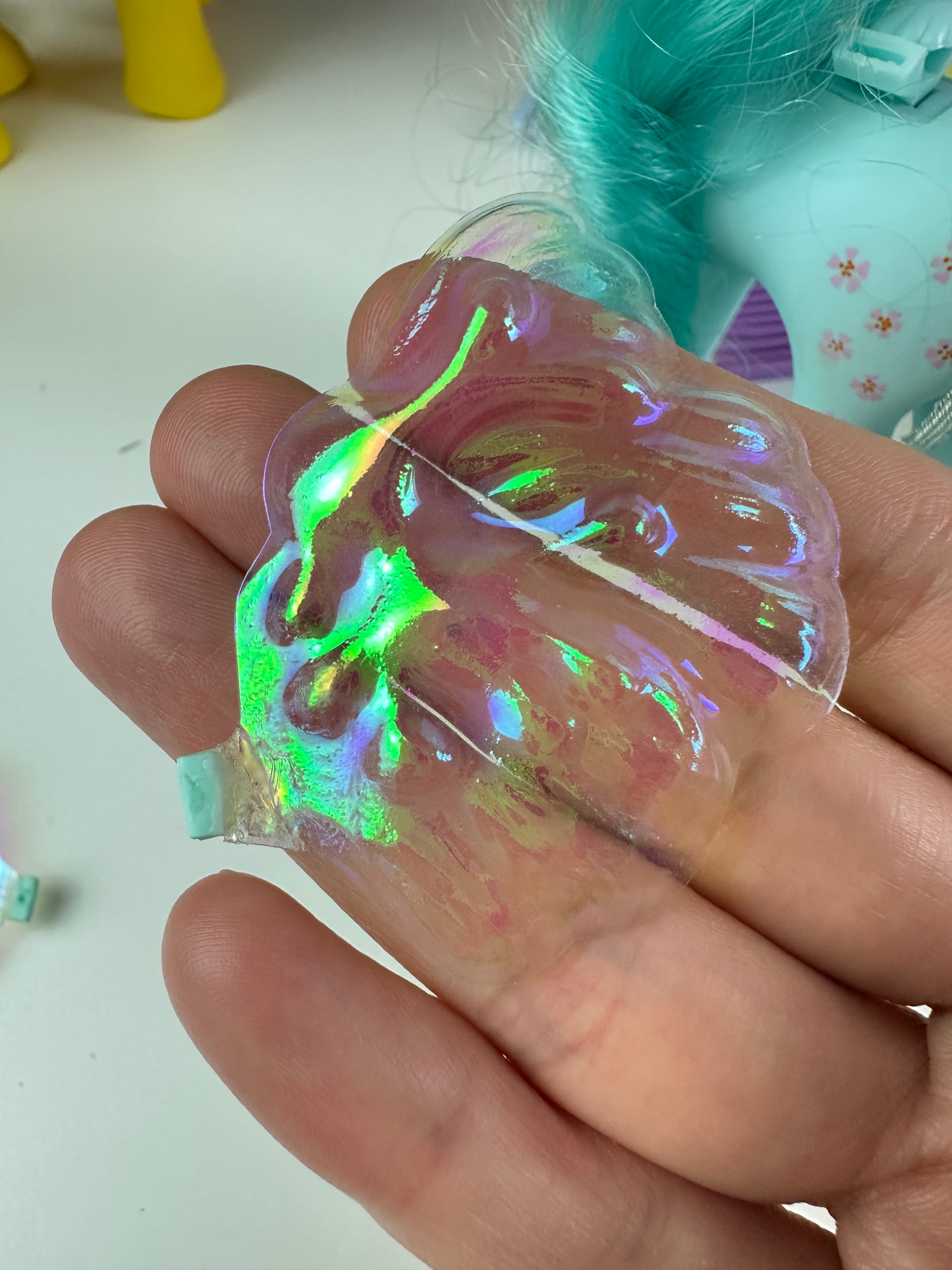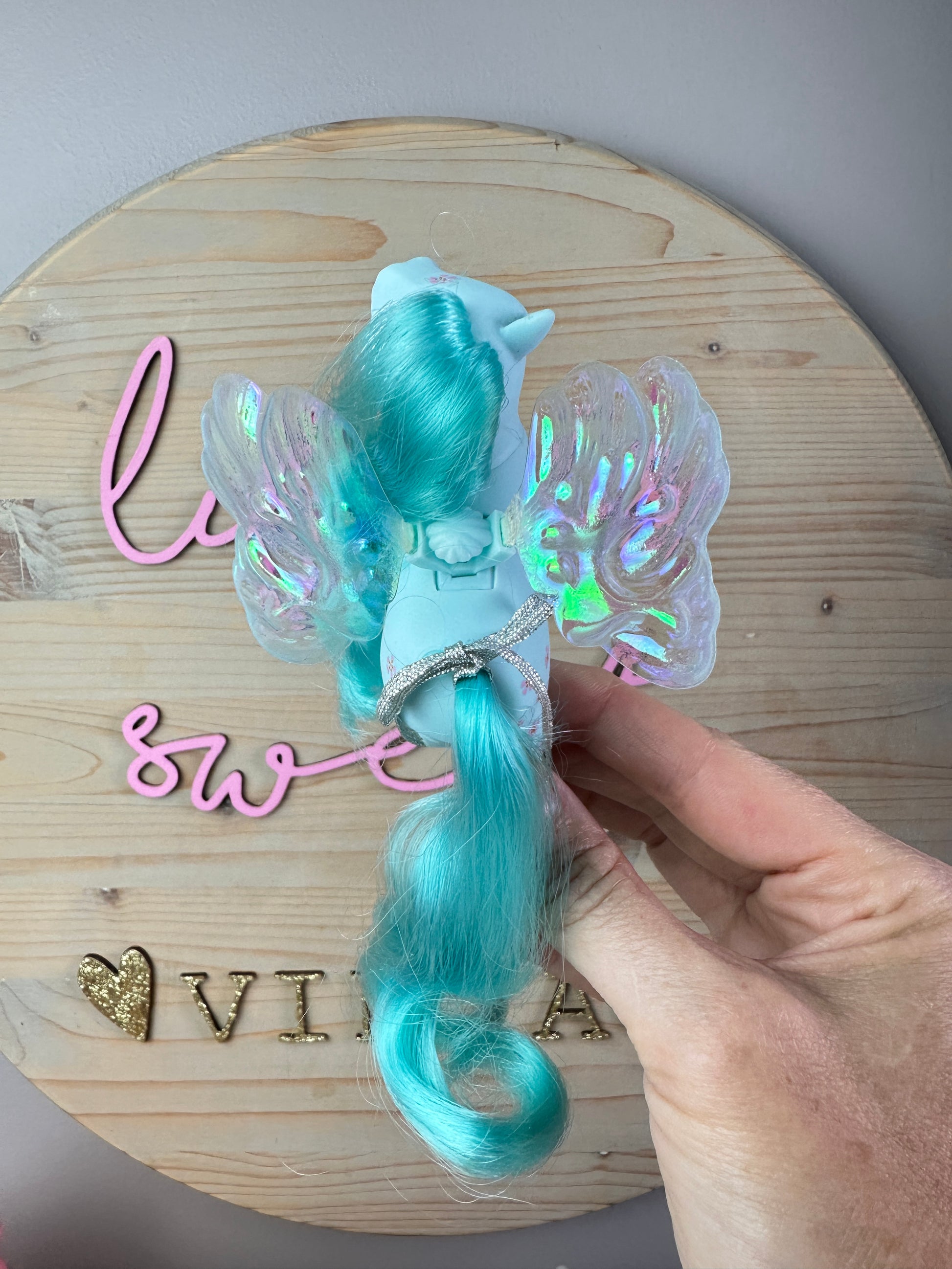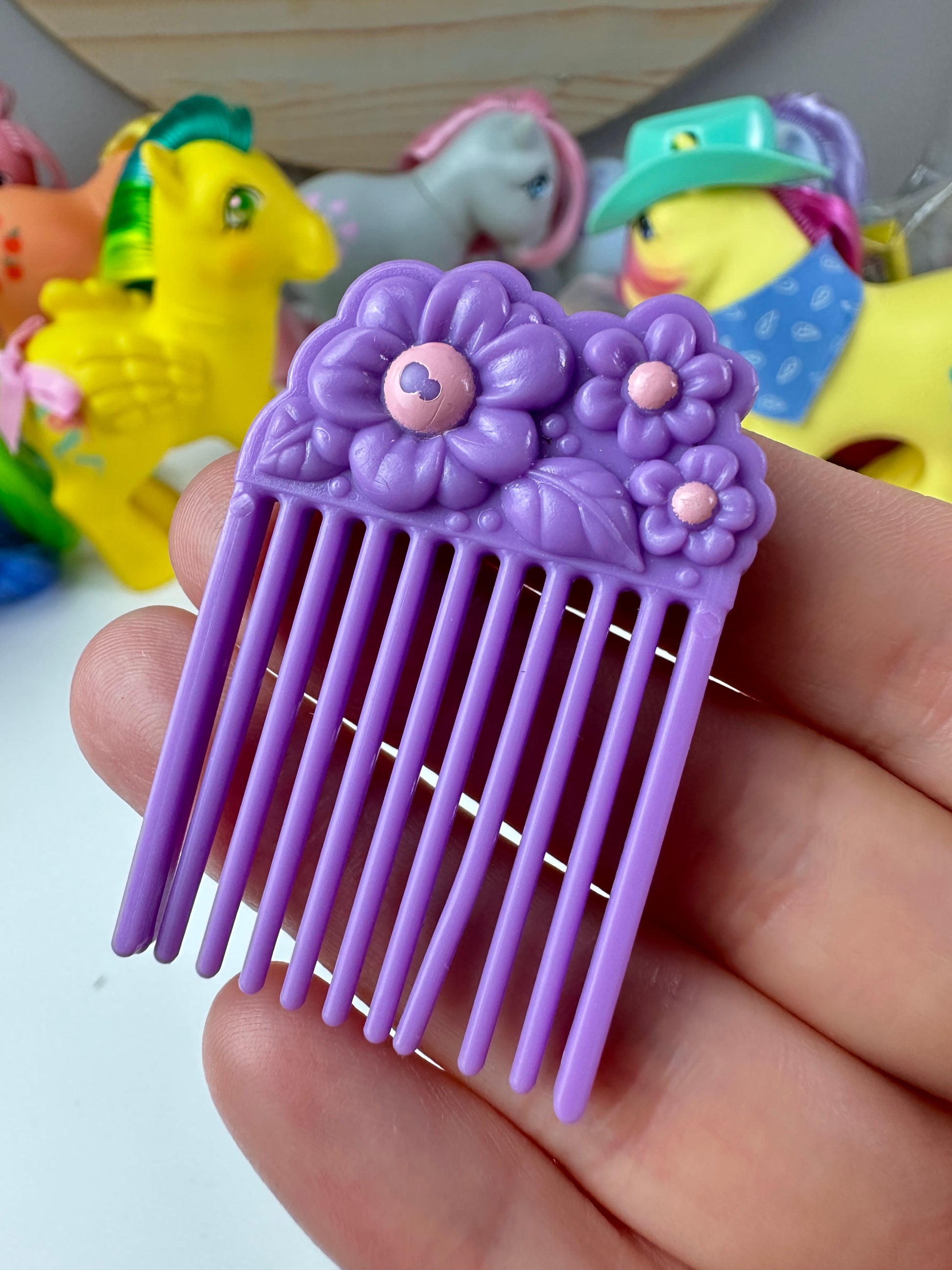 This Peach Blossom Flutter Pony is in excellent condition but her wings are repaired. One is a messier repair but they do sit nicely for display. The wings are extremely delicate and can be broken by taking them in and out of her wing holders. They could need repairs later on - these wings were brittle even back in the 80s. I've had her in my personal collection for years. She has a spot of stray paint that match her symbol (shown). Her original ribbon is included. Her comb is also included but has paint rubs.