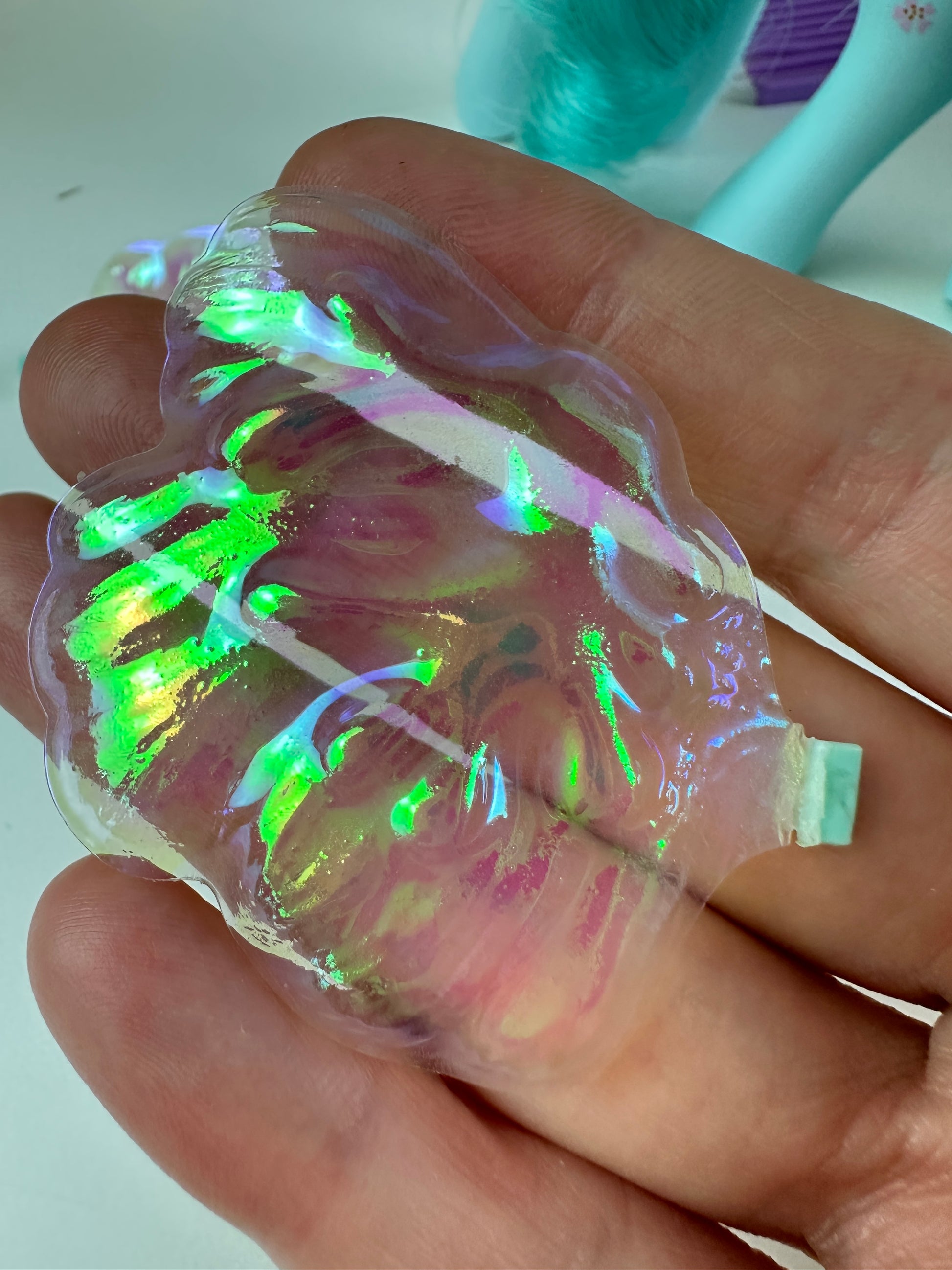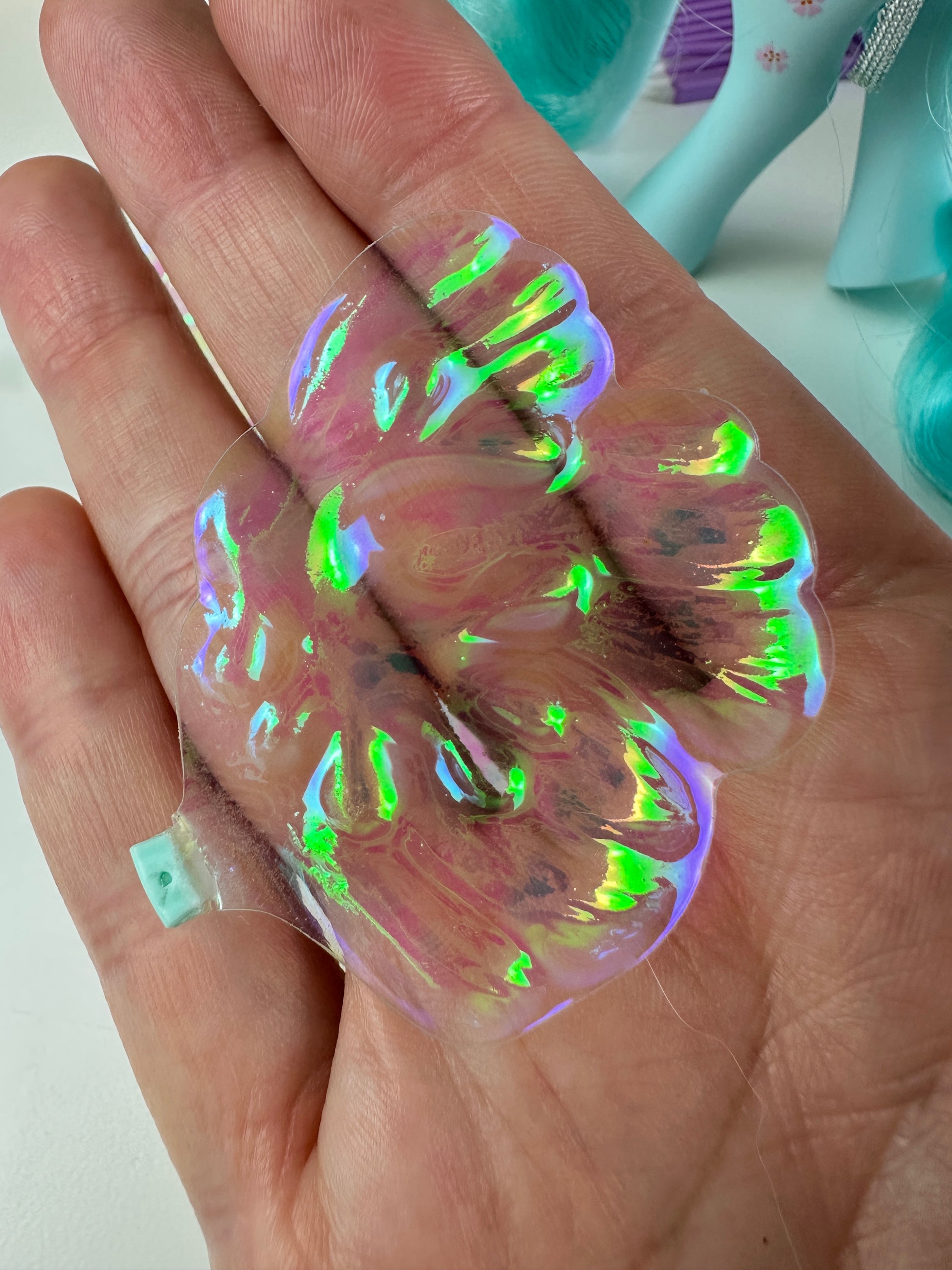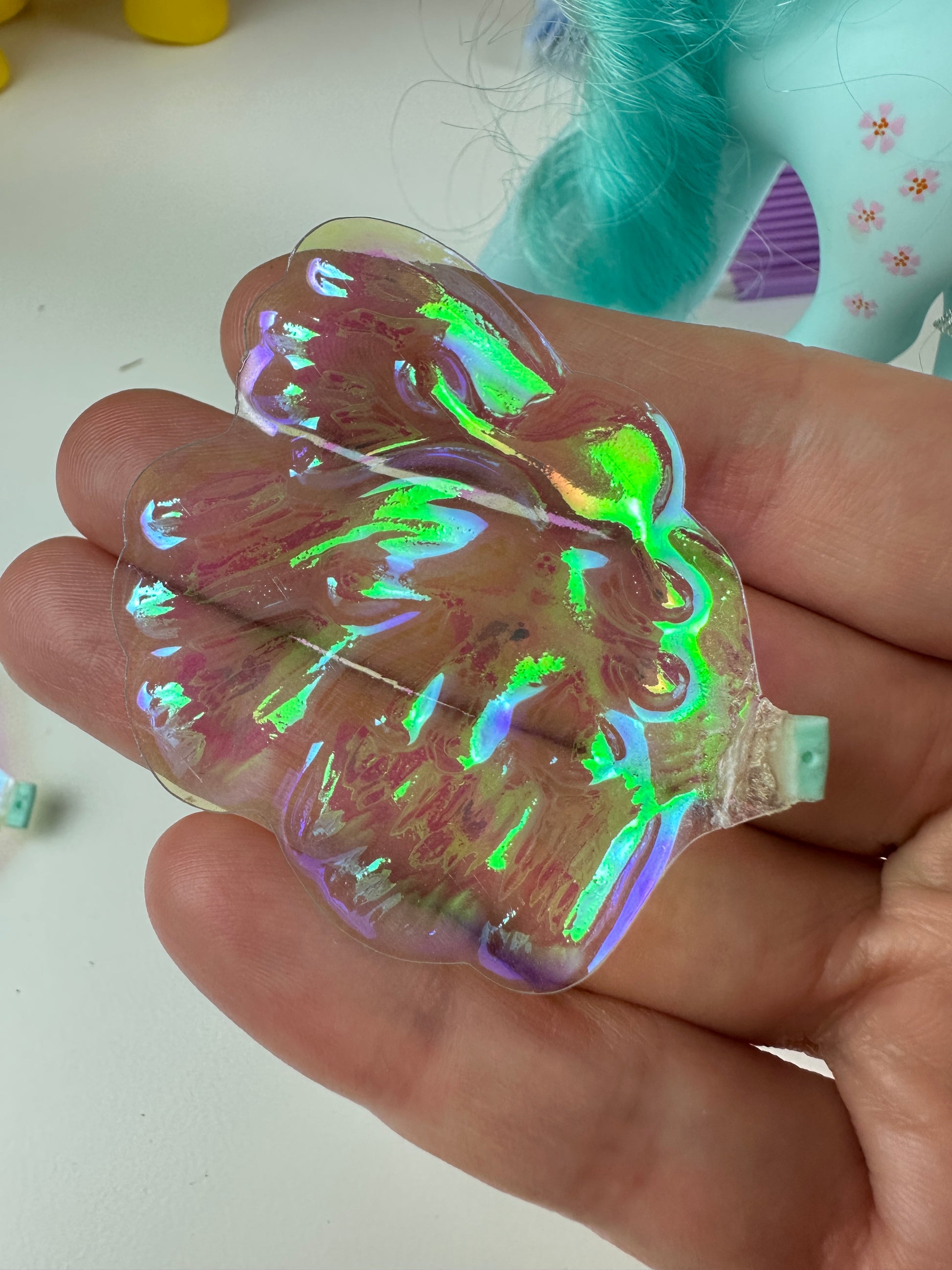 This Peach Blossom Flutter Pony is in excellent condition but her wings are repaired. One is a messier repair but they do sit nicely for display. The wings are extremely delicate and can be broken by taking them in and out of her wing holders. They could need repairs later on - these wings were brittle even back in the 80s. I've had her in my personal collection for years. She has a spot of stray paint that match her symbol (shown). Her original ribbon is included. Her comb is also included but has paint rubs.