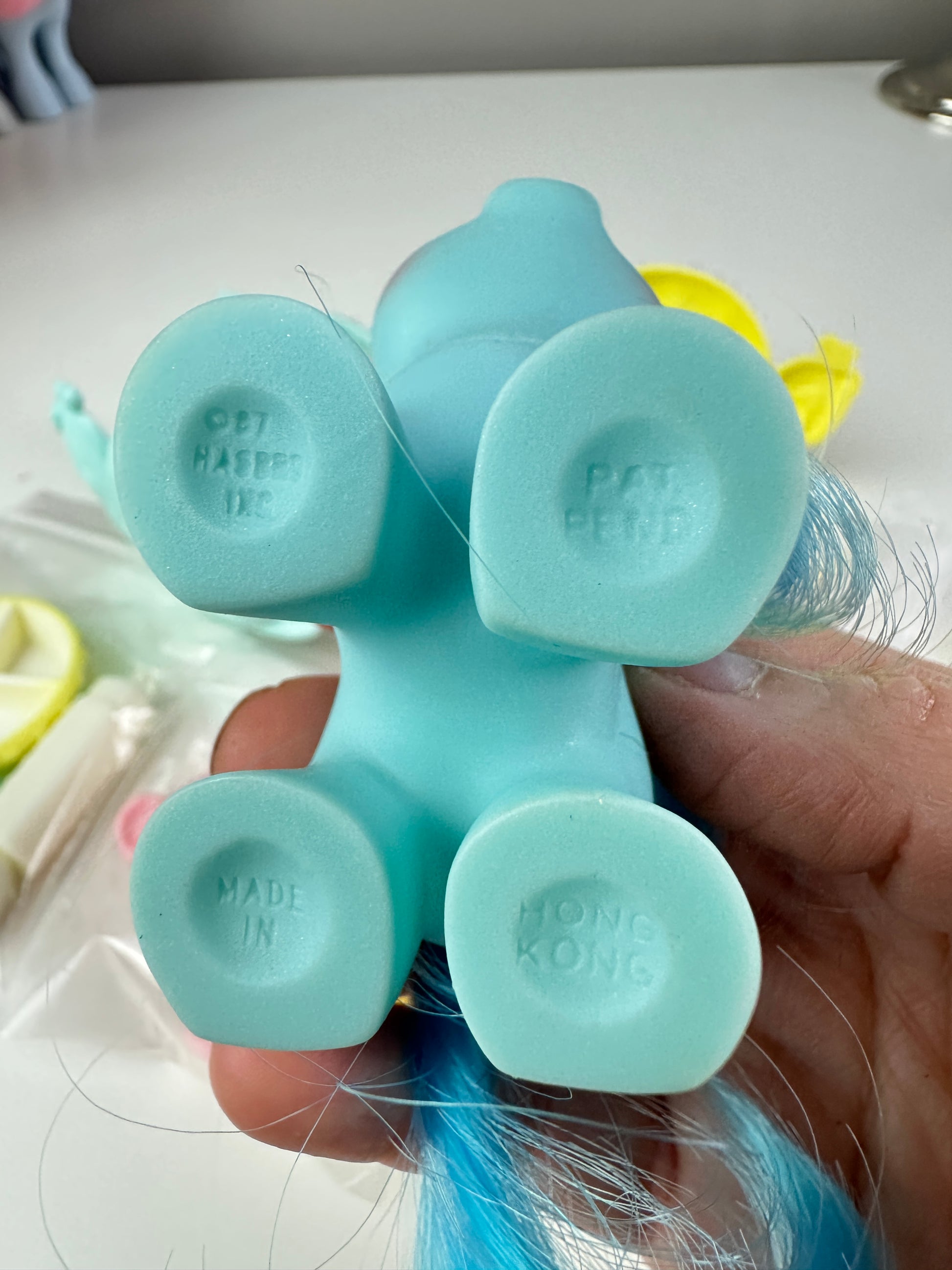 This Doodles and Nooes Newborn Twins set was previously owned by an adult collector and never played with. The pink one's hair is vibrant pink (normally found faded white). There are two unused ribbons held together by the factory plastic. The blue one has slight yellowing to ear tip.