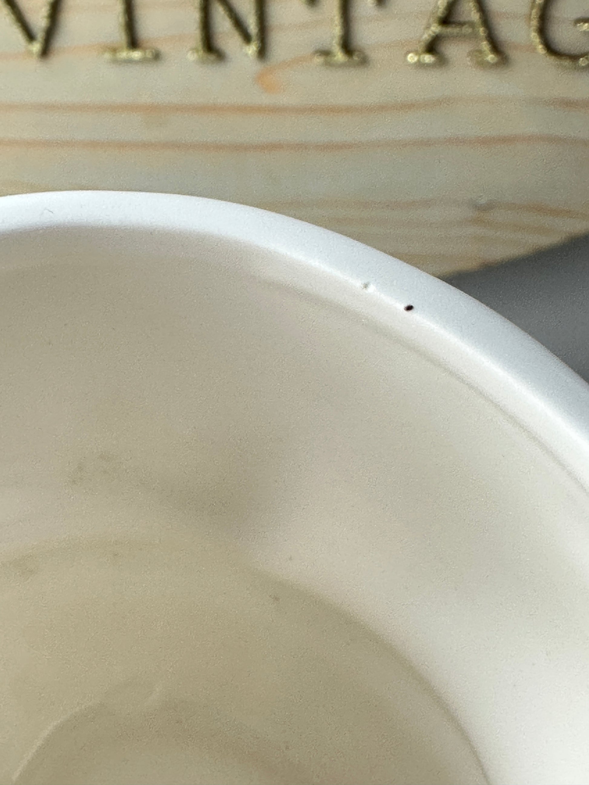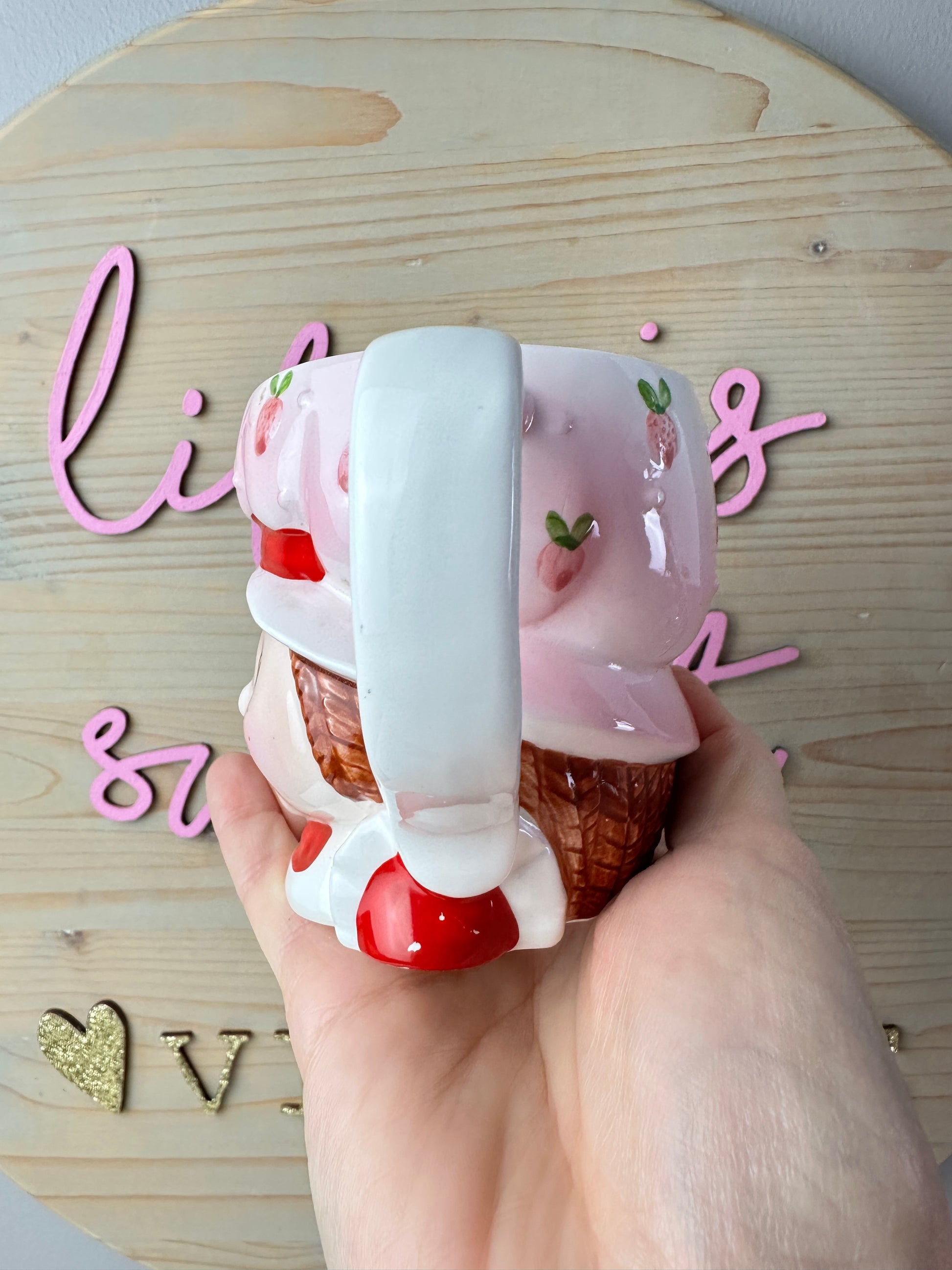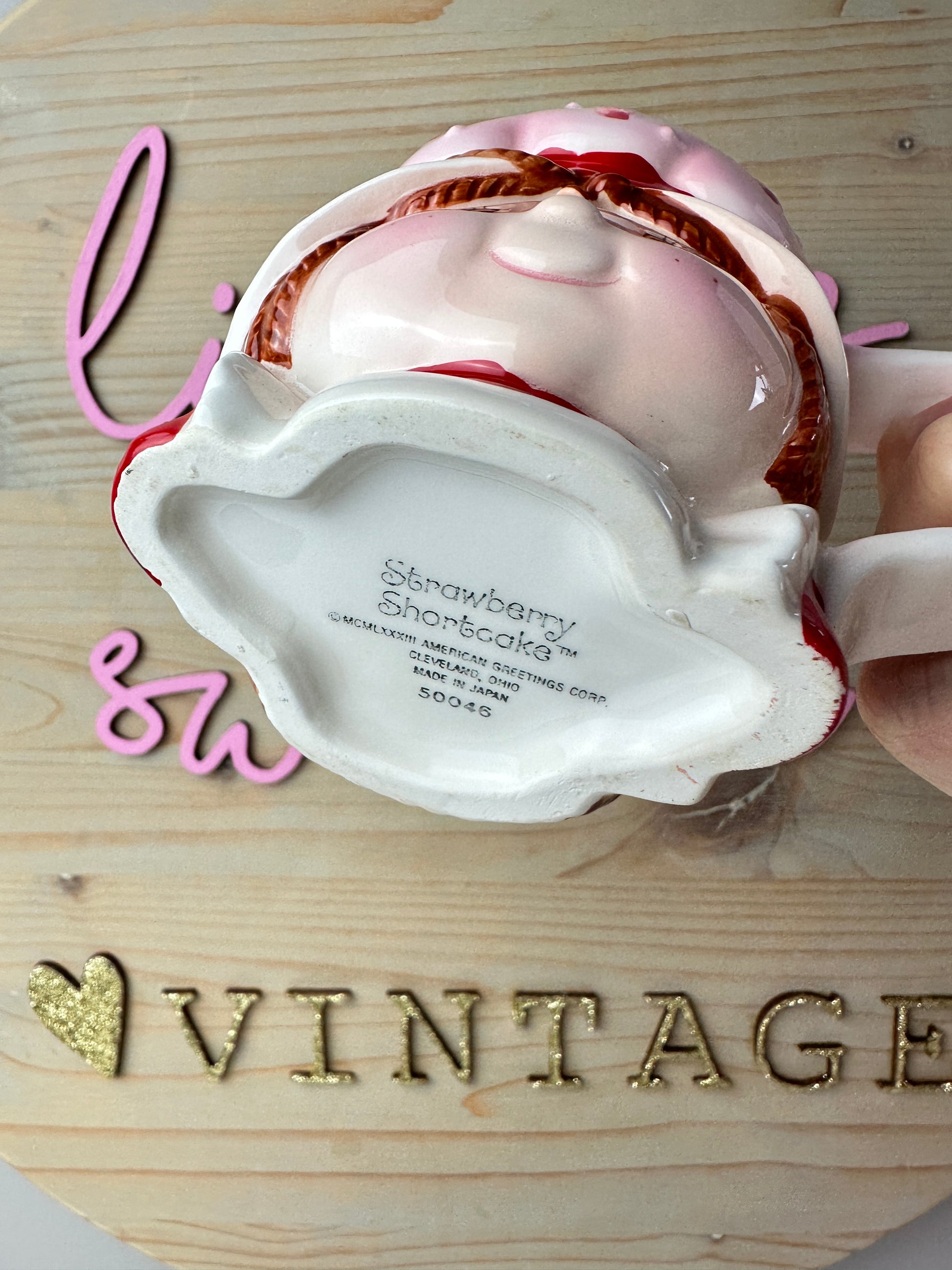This mug is so adorable! It's also very hard to find. It is in excellent condition without any real chips but it has some specks of red paint missing on the tops of the arms (on each side). There is a rough spot in the rim (a teeny spot that's shown). The black letter on the bottom is slightly worn.