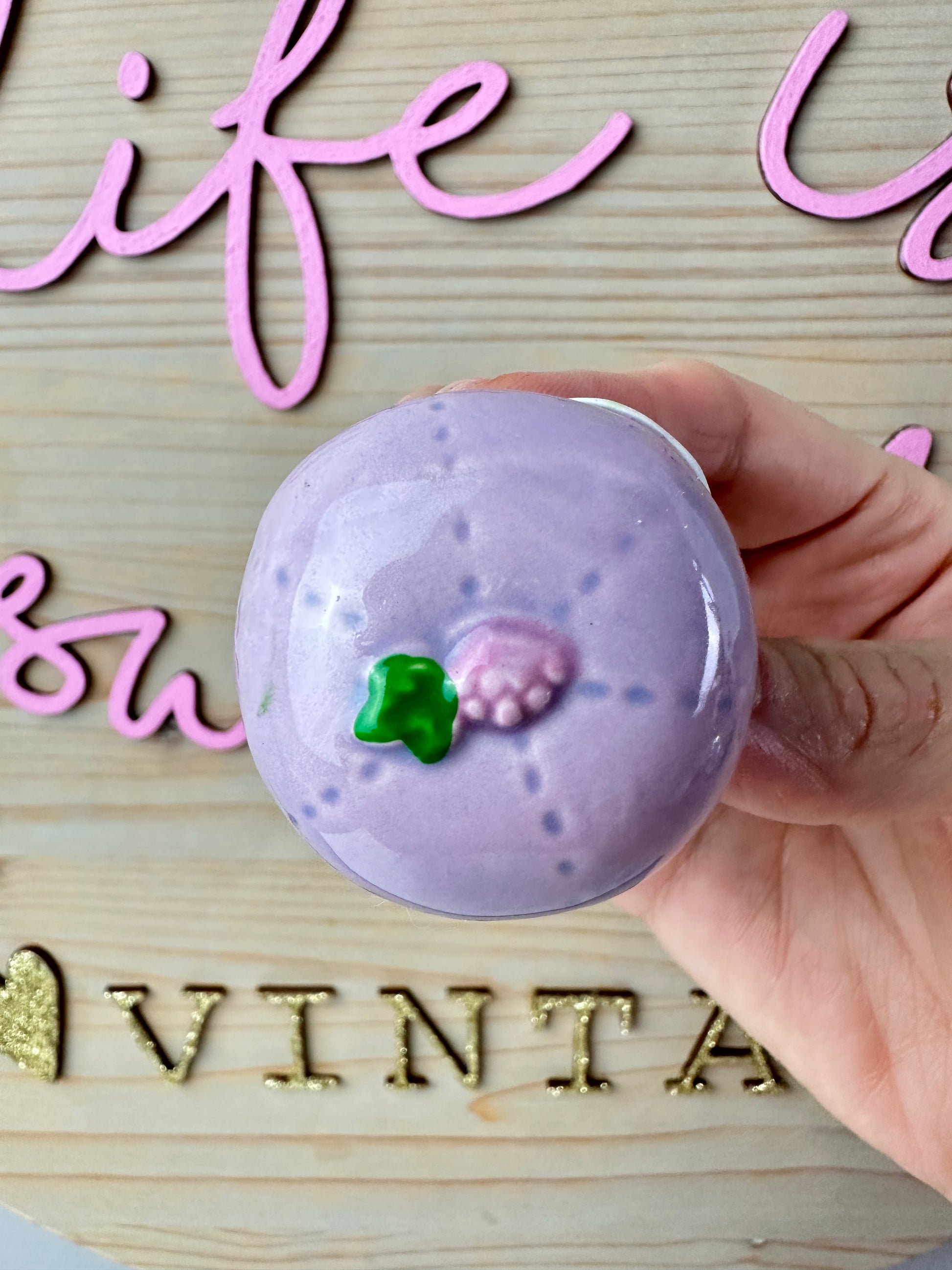 Raspberry Tart is in excellent condition with no major flaws or chips. The gold sticker from the bottom is missing. She has her original tag with some sticker residue and wear.