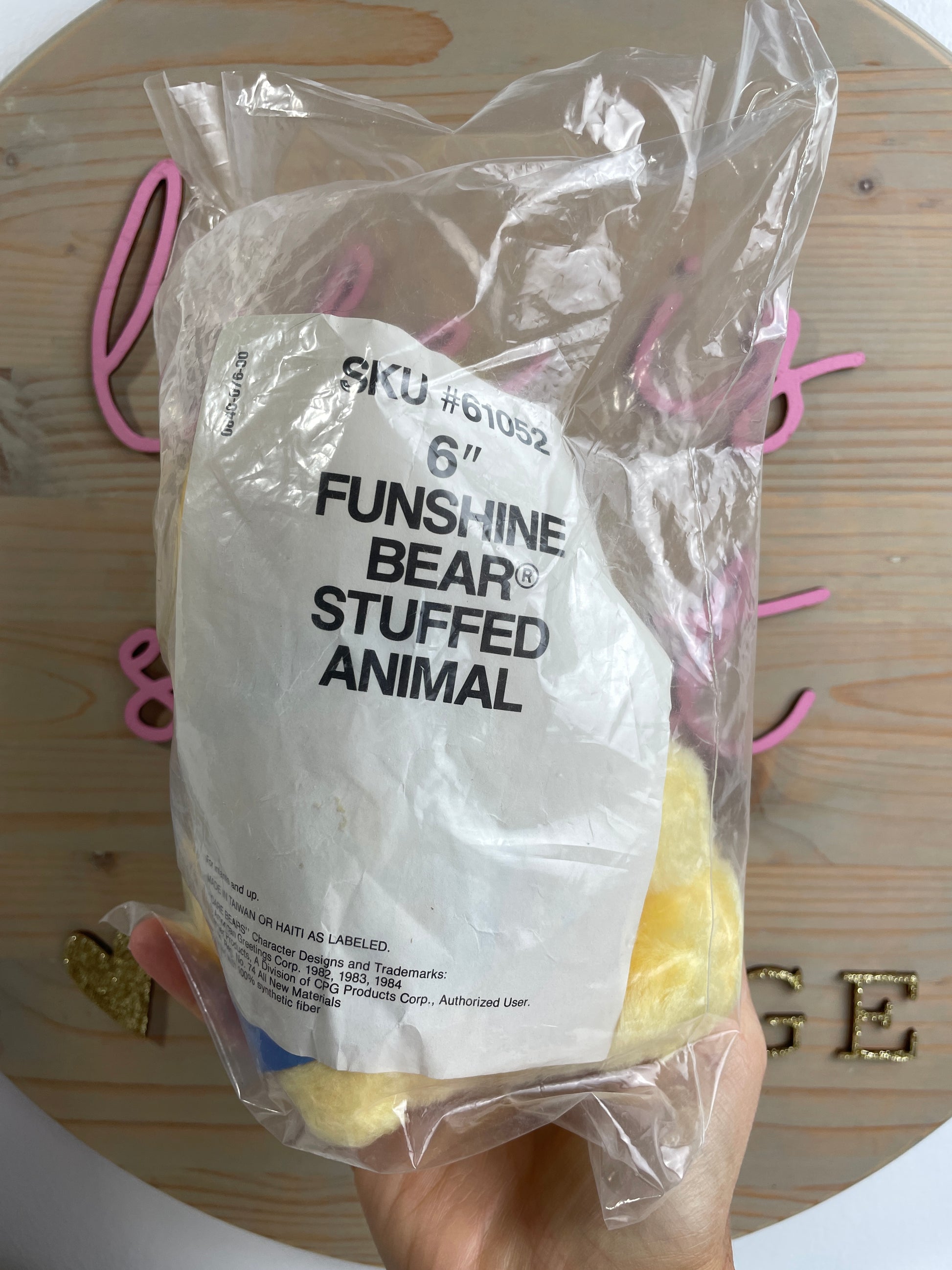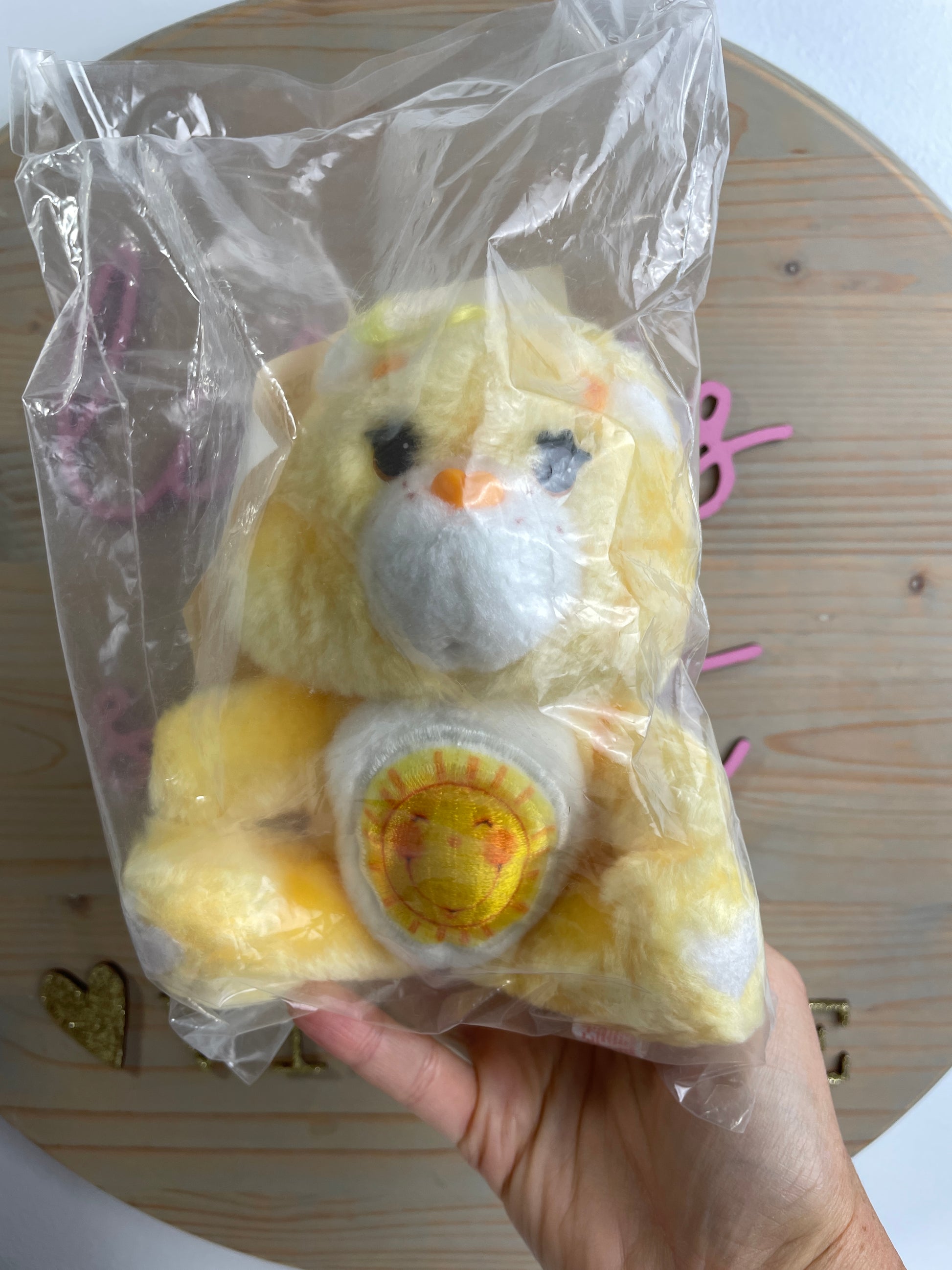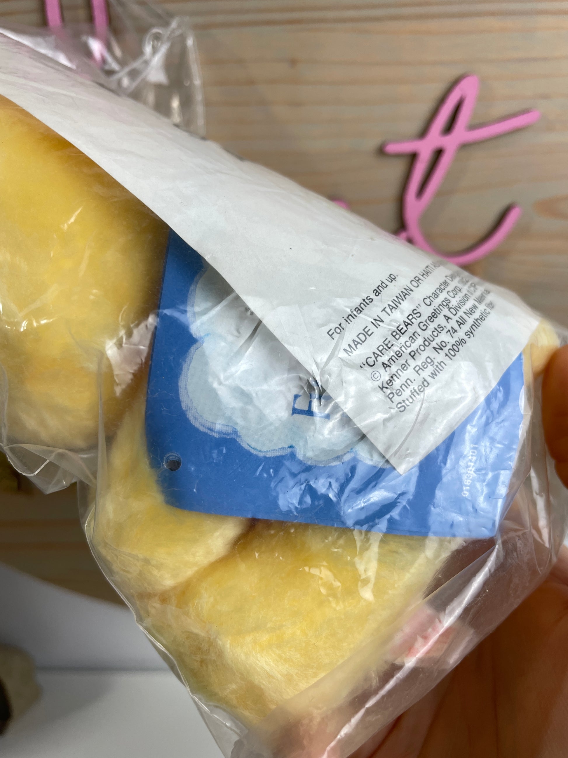 This small Funshine Bear plush is sealed in original catalog packaging. His paperwork is attached and there's also a piece of paper with his info inside the package. His tag says Made in Taiwan.