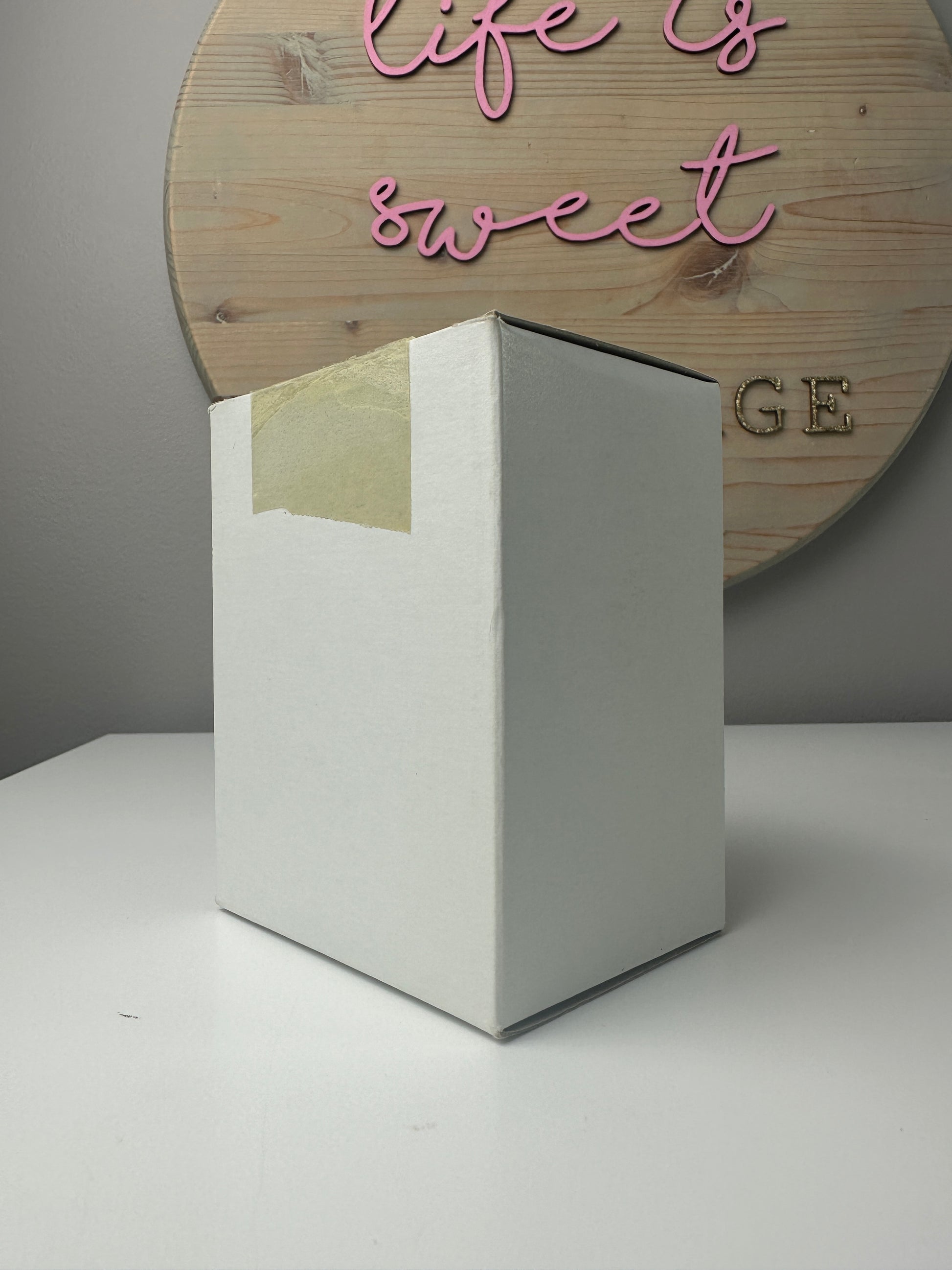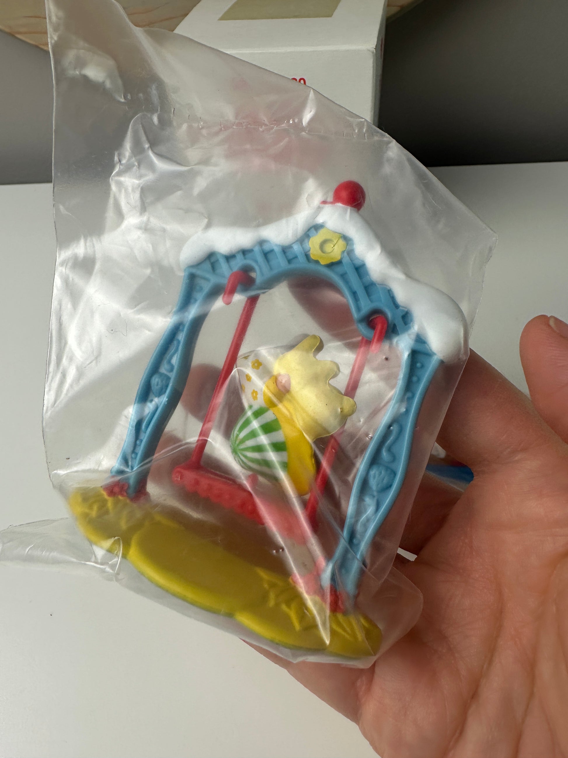 This is an ultra rare Deluxe Miniature set sold and shipped by a catalog company. It comes in a plain white box with red letters and berry points. The box is in amazing shape with yellowing to the tape. It contains two sealed Deluxe Minis: Butter Cookie and SSC Sailboat. The sailboat sail has brown spots, a common issue it.