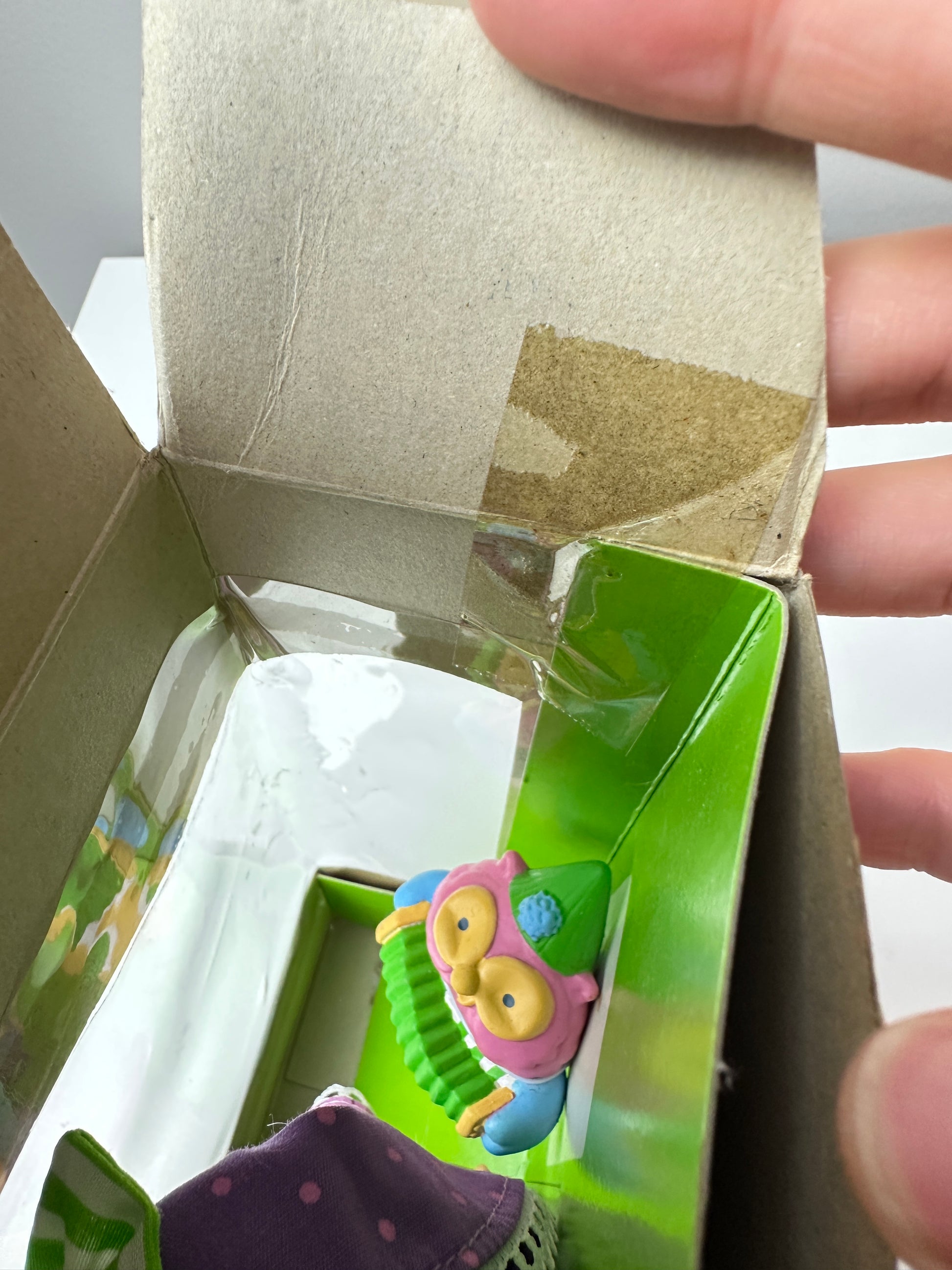 Plum Puddin' and Melonie Belle have never been removed from their box. The tape on the flaps has been cut but the insert is still taped down. I smell a faint scent when I sniff the open hox. She's the lilac glasses Soft Head version. All of the paperwork is included.